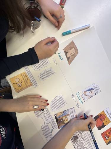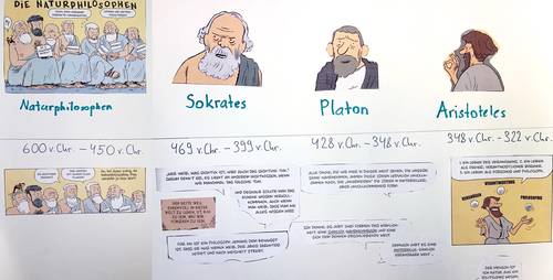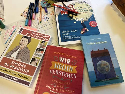 Mit der Graphic Novel «Sofies Welt» lernten die Schüler*innen die Geschichte der Philosophie sowie ausgewählte Philosoph*innen kennen. Sei es beim Tee oder auf einem winterlichen Spaziergang: die Schüler*innen diskutierten angeregt anhand philosophischer Fragestellungen.