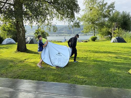 Die Oberstufenklassen und das BVJ verbrachten ihre Landschulwoche im Zeltlager in Erlach. Das Wetter zeigte sich von seiner wilden Seite – wechselhaft, nass und herausfordernd. Doch alle hielten zusammen und meisterten die Tage im Freien. Gefischt wurde wie immer ausdauernd und ein! Fisch wurde gefangen. Chefkoch Yannick riet jedoch von einer kulinarischen Verwertung ab. Als das Unwetter besonders heftig wurde, reisten wir ins Papiliorama – warm, trocken und voller Schmetterlinge. Trotzdem (oder gerade deswegen) blicken wir mit Vorfreude aufs nächste Jahr – dann hoffentlich mit mehr Sonne, aber genauso viel Abenteuer.
